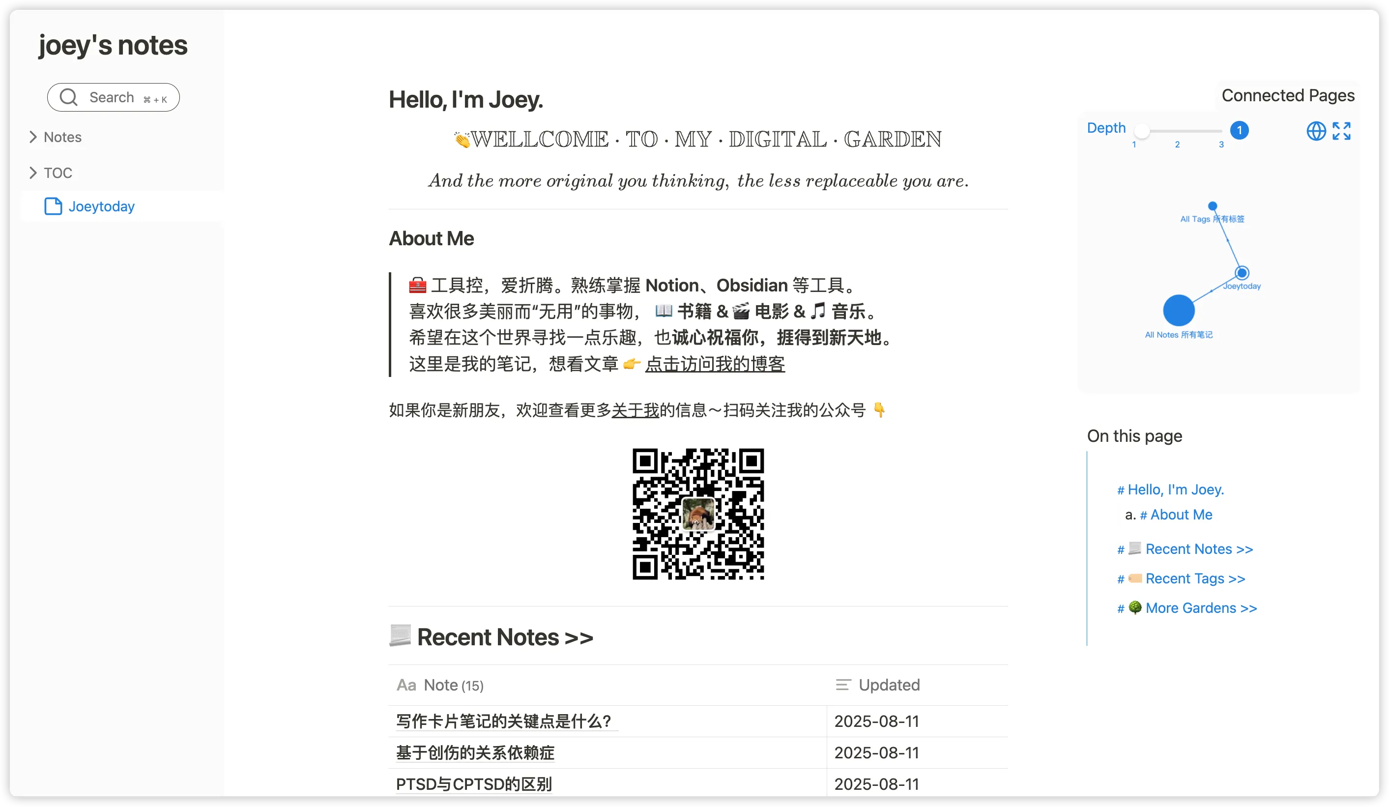 使用 Obsidian 写作的朋友们有福了,Obsidian 中的 Digital Garden 插件(后称 DG)可以直接发布到网页,直接生成个人网站,整体比较简洁,能够满足不想写代码,但想发布自己的内容的朋友们~